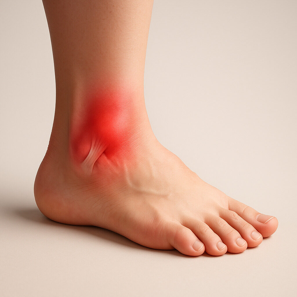 もっとも多いのが「内返し捻挫」と呼ばれるタイプで、足首が内側にグッとひねられたことで 外くるぶしの靱帯(前距腓靭帯など)を痛めるケガ です。